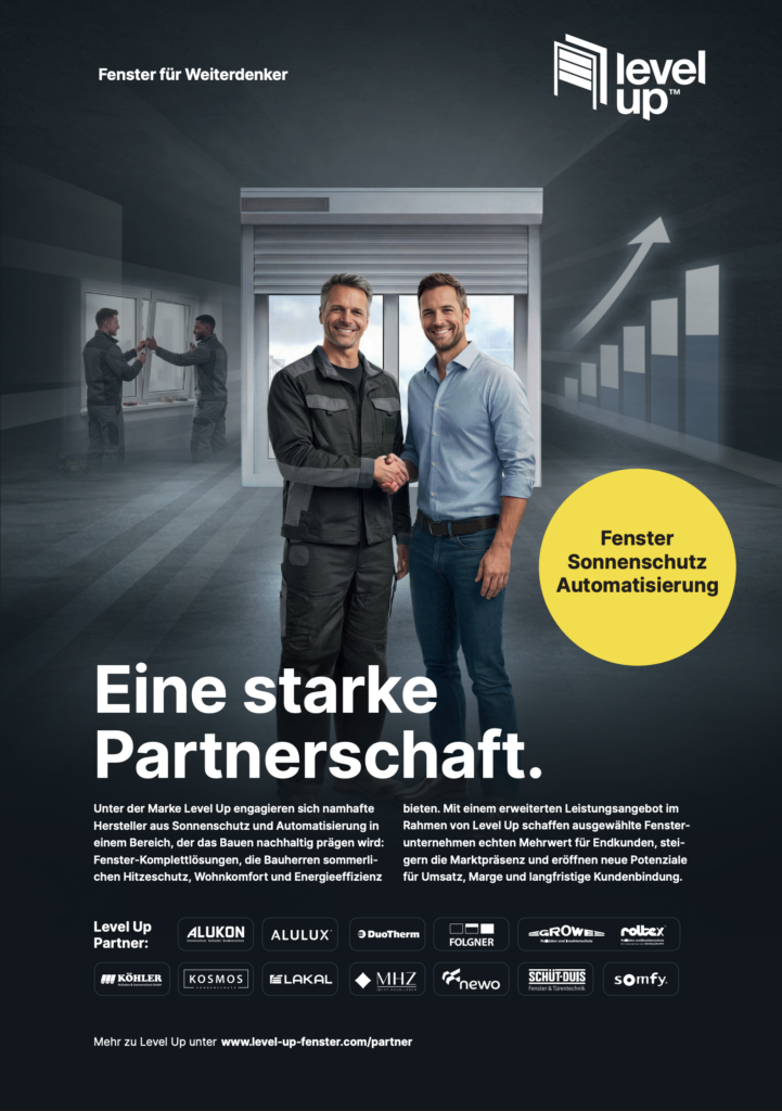 Level Up – Fenster für Weiterdenker – ist ein Branchenkonzept für mehr Umsatz und Marge über alle Vertriebsstufen FENSTER, BESCHATTUNG + AUTOMATION hinweg; initiiert von Somfy mit dem Ziel, Endkunden zukunftssichere und klimafitte Komplettlösungen für Fenster zu bieten.