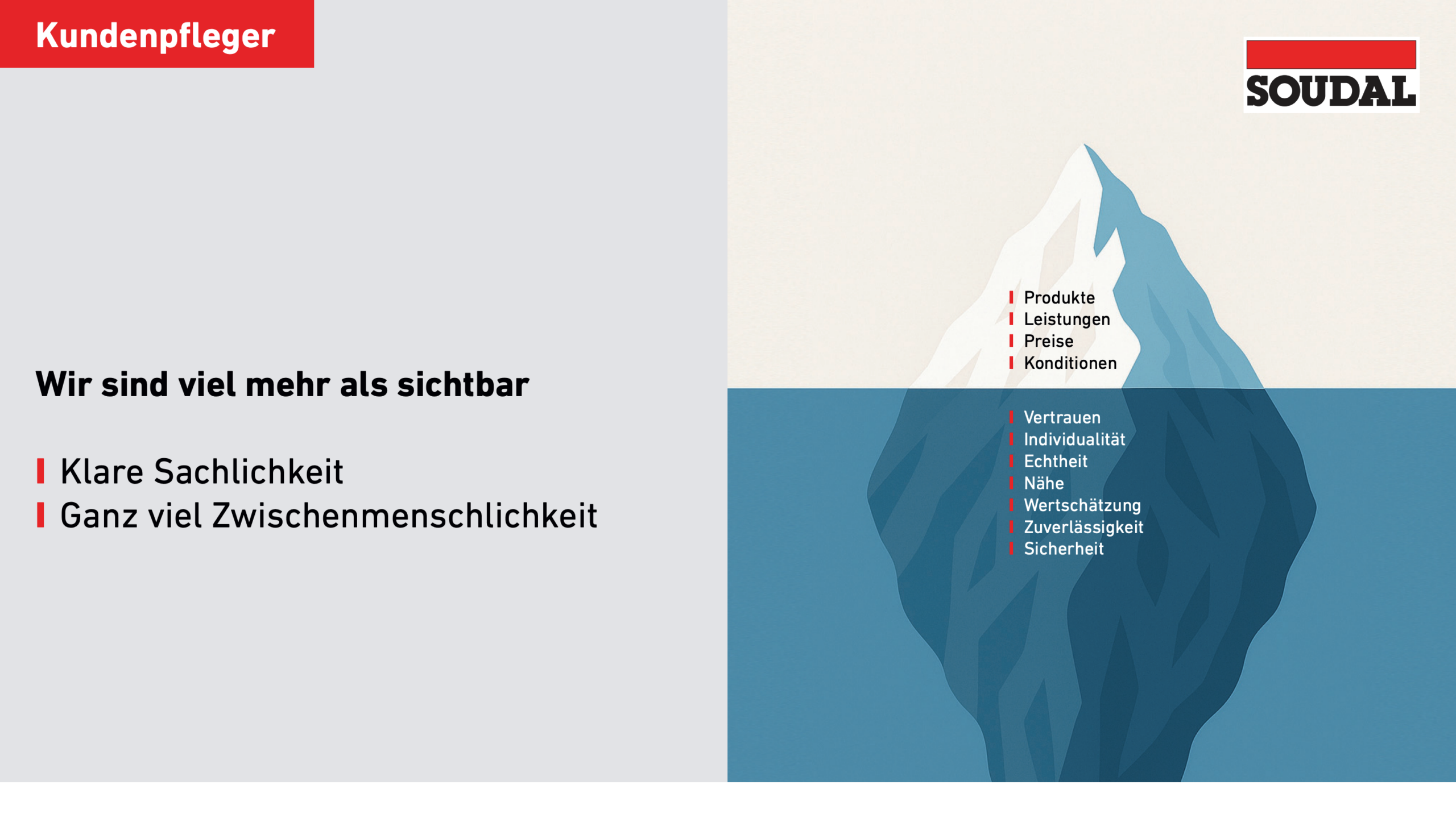 Durch die wiederkehrende Symbolik entstand eine hohe Wiedererkennbarkeit. Gleichzeitig ermöglichte das Herz als Metapher, komplexe technische Zusammenhänge emotional zugänglich zu machen, ohne an fachlicher Tiefe zu verlieren. [Soudal_Fen…erbau_2026 | PowerPoint], [004754-DES…au-2026_DE | PDF]