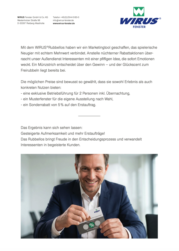 Mit dem WIRUS®Rubbellos haben wir ein Marketingtool geschaffen, das spielerische Neugier mit echtem Mehrwert verbindet. Anstelle nüchterner Rabattaktionen überrascht unser Außendienst Interessenten mit einer pfiffigen Idee, die sofort Emotionen weckt. Ein Münzstrich entscheidet über den Gewinn – und der Glückscent zum Freirubbeln liegt bereits bei.