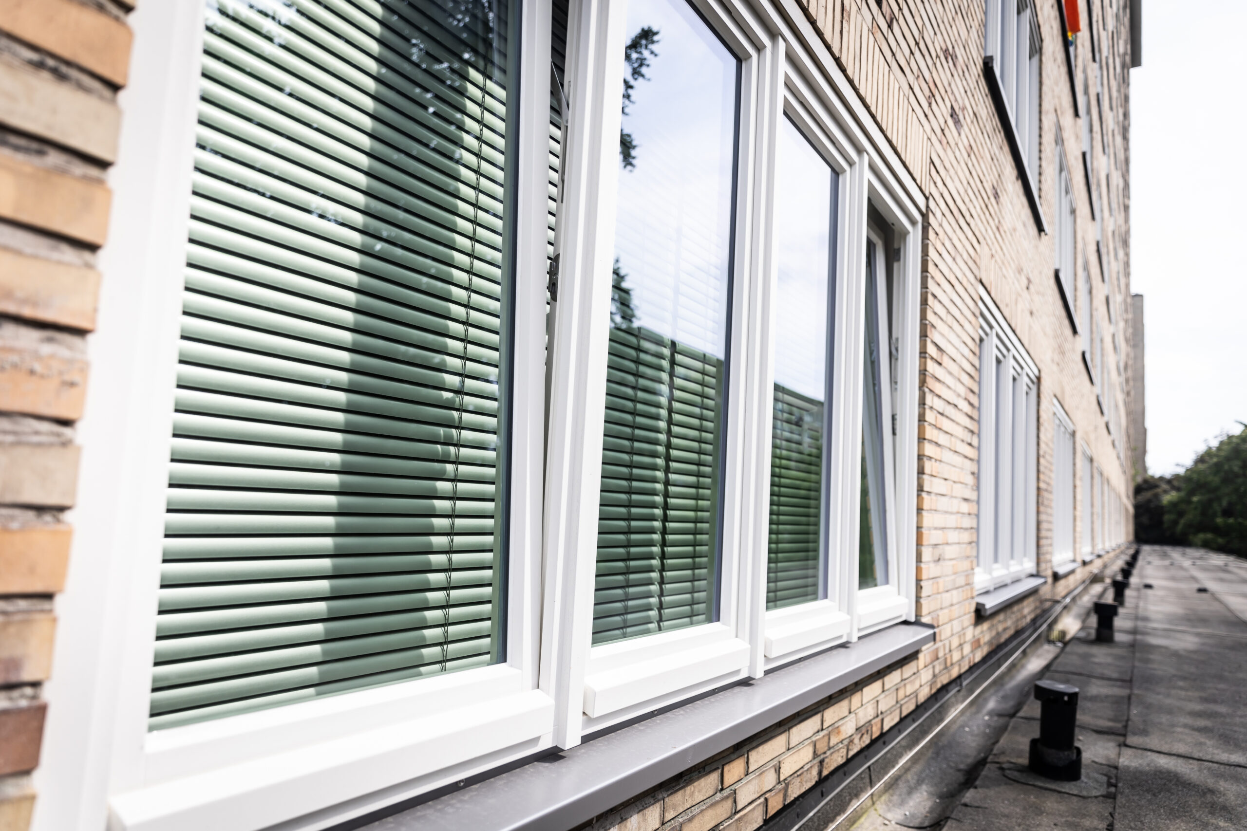 Die neuen Kastenfenster sind mit einer integrierten Verschattungsanlage ausgestattet. Diese besteht aus automatischen Verbundjalousien mit 35 mm breiten Lamellen, die zwischen den beiden Fensterrahmen verlaufen. Diese Lösung ermöglicht es, die Räume tagsüber kühl zu halten, während gleichzeitig eine natürliche Belüftung durch das äußere Fenster gewährleistet wird. Die Jalousien können unabhängig bedient werden.
